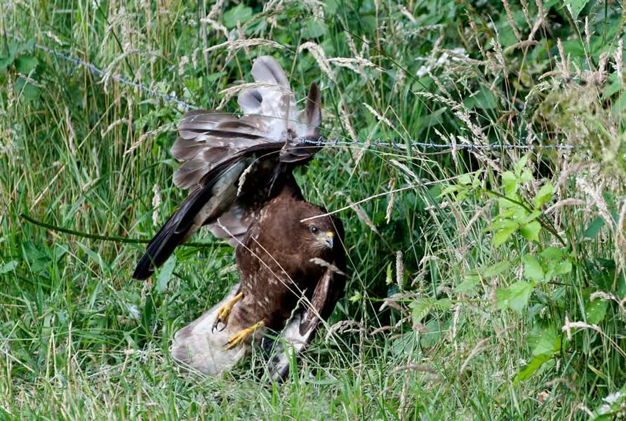 Buizerd zit vast in prikkeldraad in Rietmolen