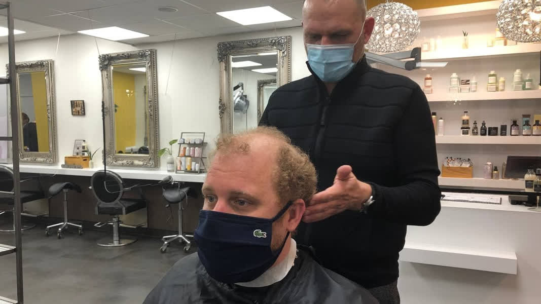 Burgemeester Joris Bengevoord van Winterswijk was woensdagochtend als een van de eersten aan de beurt om zijn haar te laten knippen. Na een maandenlange sluiting mogen de deuren van kappers weer open, met een overvolle agenda tot gevolg.