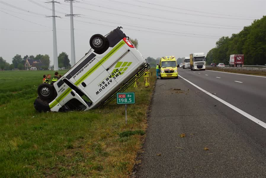 Een bedrijfsbusje is dinsdagmiddag op de kop terecht gekomen langs de snelweg A18 bij Wehl. De bestuurder is daarbij met de schrik vrijgekomen.