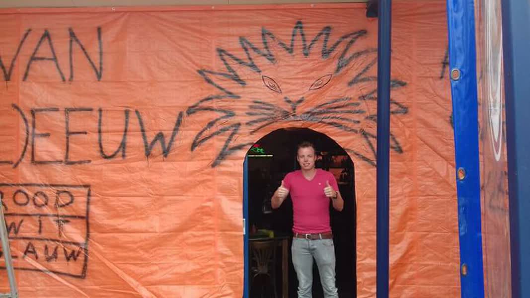 Een groot zeil kleurt de gevel van het eetcafé in de Veldhoek oranje. Een gat bij de deur zorgt ervoor dat mensen naar binnen kunnen tijdens de halve finale van het EK Vrouwenvoetbal. Tijdens de kwartfinale kwamen tientallen mensen naar het café om de leeuwinnen naar de overwinning te schreeuwen.