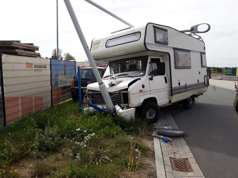 De bestuurder van de camper moest rond 12.30 uur uitwijken voor een aantal heftrucklepels die op het wegdek van de Riezenweg lagen. Het voertuig kwam daarbij hard in aanraking met de lantaarnpaal. Het is niet bekend hoe de objecten op het wegdek terecht waren gekomen.