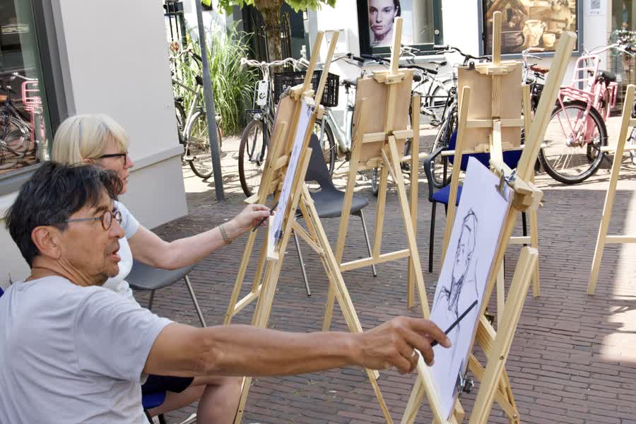 In de Meddosestraat stonden schildersezels in een kring opgesteld, vlak onder de muurschildering van schrijver Gerrit Komrij. Hier mochten voorbijgangers zelf aan de slag met houtskool, een eerbetoon aan kunst én aan de Winterswijkse grootheden. “Je wilt niet weten hoe vaak hier vandaag mensen een foto maken", zegt tekendocent Hans van Weerd van de Winterswijkse Academie voor de Schilderskunst. De Ulftenaar geniet zichtbaar van de spontane sfeer. “De meeste mensen lopen geïnteresseerd voorbij, en sommigen gaan gewoon zitten en beginnen. Ik vind het vandaag leuk om het tekenen over te brengen. Portrettekenen is een grotere stap om te zetten dan wanneer ik vandaag een grote bos bloemen op tafel had gezet.”
