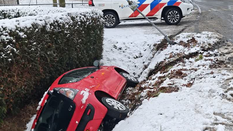 Auto belandt door gladheid zijwaarts in de sloot