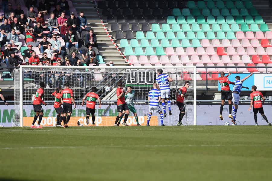 De eerste kans van de wedstrijd was na een kwartier spelen voor de gasten uit Doetinchem. De Graafschap-middenvelder Danny Verbeek stuurde Daryl van Mieghem de diepte in, maar de aanvaller van de Superboeren zag dat NEC-doelman Norbert Alblas zijn inzet kon keren. Na iets meer dan een half uur spelen dacht NEC-middenvelder Elayis Tavsan de 1-0 op het bord te zetten, maar hij werd afgevlagd voor buitenspel. Vlak voor rust was De Graafschap dichtbij de openingsgoal, toen verdediger Ted van de Pavert net voorlangs de goal van Alblas kopte.