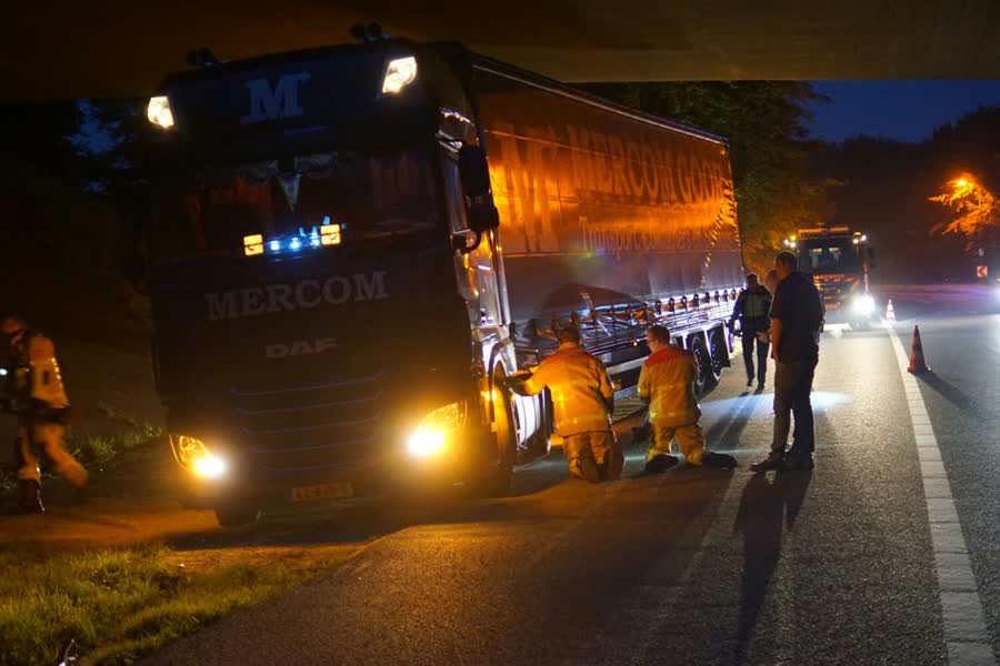 Daar bleek er een flink gat in de dieseltank te zitten, waardoor de vloeistof eruit liep. De ter plaatse gekomen brandweerlieden hebben dammen gebouwd om te voorkomen dat de diesel verder over de snelweg liep. Een sleepdienst heeft uiteindelijk de tank leeggepompt en de vrachtwagen afgesleept.