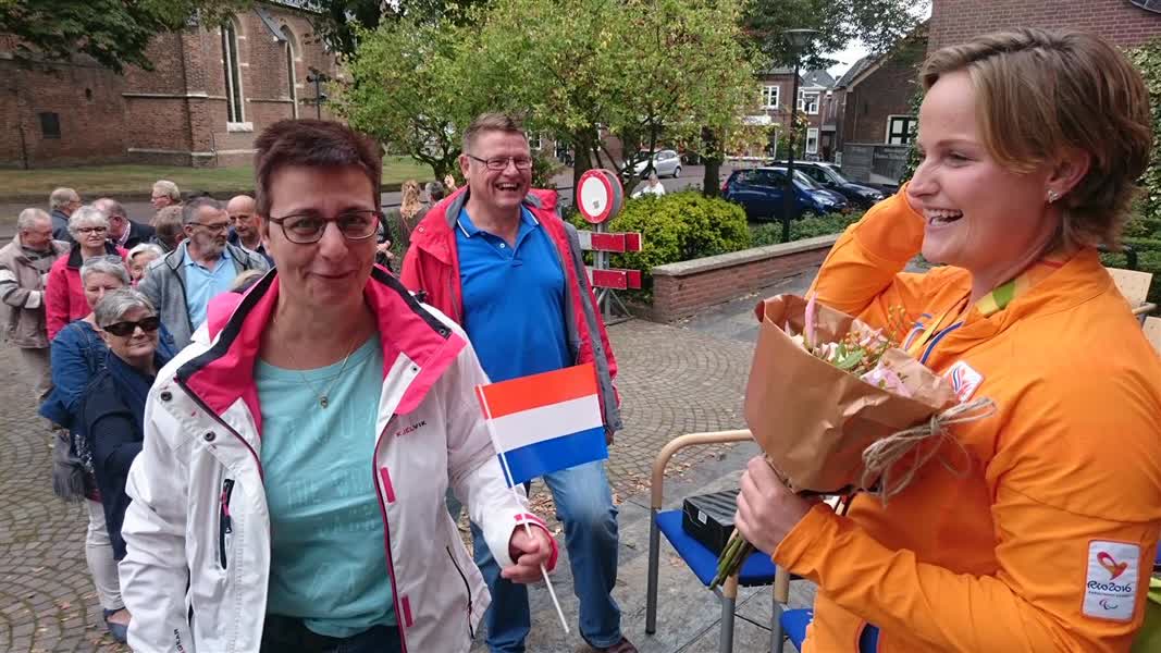 "Het is echt prachtig om in je eigen dorp zo’n onthaal te krijgen", aldus een zichtbaar geëmotioneerde Aniek van Koot. "Heel bijzonder. Ik blijf ook alleen maar lachen. Het is echt heel fijn." Naast de felicitaties en cadeaus van vrienden, familie en andere geïnteresseerde dorpsgenoten, had de gemeente Aalten ook nog een verassing voor Van Koot. De rolstoeltennisster is namelijk het eerste officiële sporticoon van de gemeente.