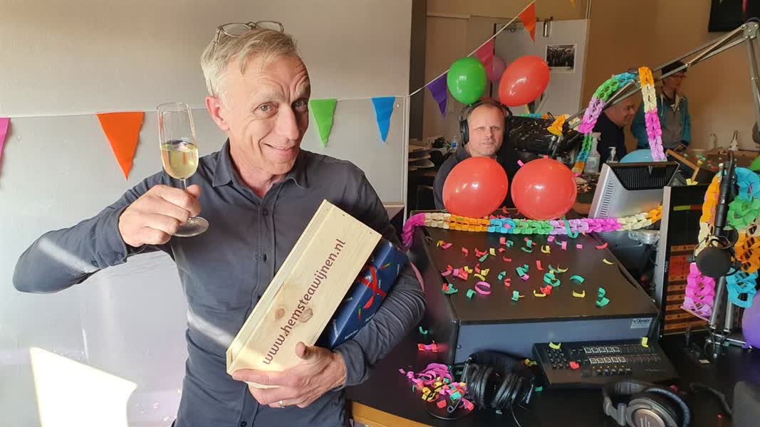 Dj Balthazar van Puffelen is vrijdag in de radiostudio van Optimaal FM in Ulft verrast voor zijn 25-jarig jubileum. De radiomaker, die in de jaren '90 van de landelijke radio terugkeerde naar de streek, werd bedolven onder de felicitaties.