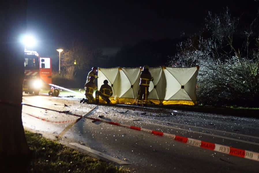 De auto belandde met de wielen in de berm, schoot door een weiland, raakte een boom en kwam in een tuin tot stilstand. De hulpdiensten rukten groot uit en vanwege de ernst van de verwondingen werd ook een traumahelikopter gealarmeerd, maar die werd later afgezegd.