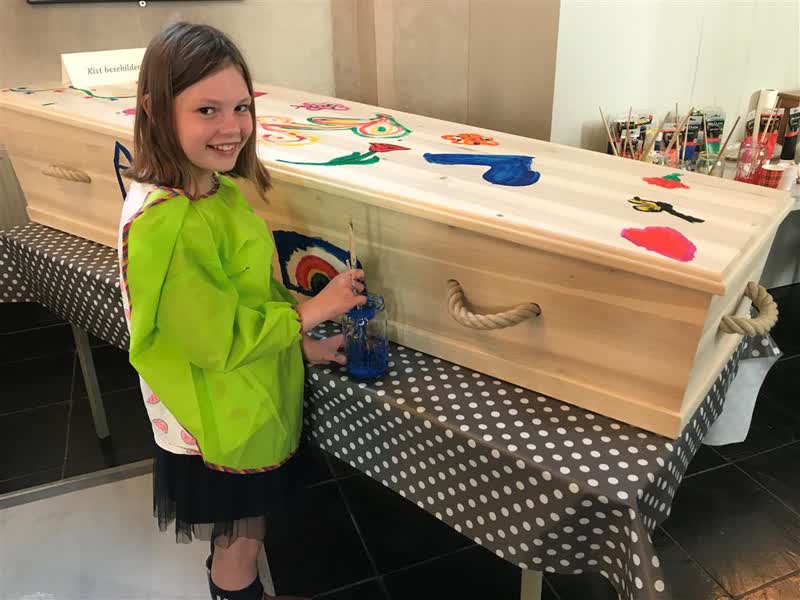 Bezoekers kregen in de Lambertikerk ook de kans om een doodskist te beschilderen. “Ik ben een regenboog aan het schilderen”, vertelt Fenne, die verwacht dat een groot deel van haar angst rond de dood wordt weggenomen. “Eerst dacht ik altijd, als ik over de dood praat, dat ik erover zou gaan dromen. Ik denk dat dat niet meer gaat gebeuren nu ik hier ben geweest.” Fleur vult aan: “De dood is soms nog een taboe, ik vind dat daar wel wat meer informatie over kan worden gegeven, om mensen te inspireren. De dood kan heel cru zijn, maar de dood kan ook heel mooi zijn.”