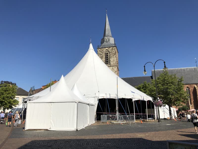 Extra bomen op de Markt, waar dan? Inmiddels staat de grote feesttent aan de zuidkant van de Markt, voor het Volksfeest van dit weekeinde. Die beslaat bijna de volledige zuidzijde. Aan de noordkant worden ook twee grote tenten opgebouwd voor het Volksfeest, ook daar is amper ruimte voor extra bomen. Laat staan voor waterpartijen.