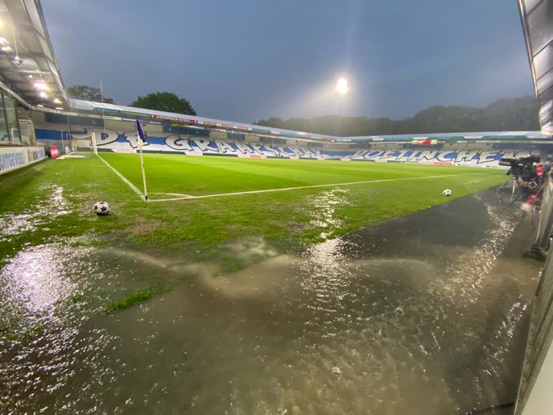 Het duel tussen De Graafschap en Helmond Sport is woensdagavond na ruim een half uur spelen stilgelegd in Doetinchem, omdat het veld vanwege een hoosbui onbespeelbaar was geworden. Nadat de wedstrijd bijna anderhalf uur stil lag, besloot scheidsrechter Rob Dieperink dat er om 22.00 uur weer hervat kon worden.
