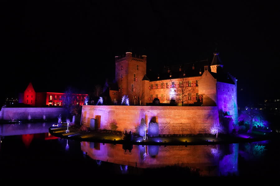 “We gebruiken bijna vijfhonderd LED armaturen om alles te kunnen kleuren”, vertelt Dennis Huurenkamp van T3 Live, het bedrijf dat de lichtshow heeft verzorgd. “Ook bewegende verlichting, fonteinen, rookeffecten, eigenlijk alles om een mooie show te kunnen creëren.” Die show is een nieuw element. Iedere twintig minuten was het lichtspektakel te zien vanaf de Wal achter Kasteel Huis Bergh. Het was helemaal aangepast aan het thema van dit jaar: 'Dromen'. “Het is opgezet met muziek, fonteinen en effecten, waardoor het dus een droom wordt waar je je in begeeft”, vertelt Huurenkamp. Esther Peppelman is een van de bezoekers bij de show: “Het was heel cool met alle geluidseffecten, de lichten en de rook tussendoor.”