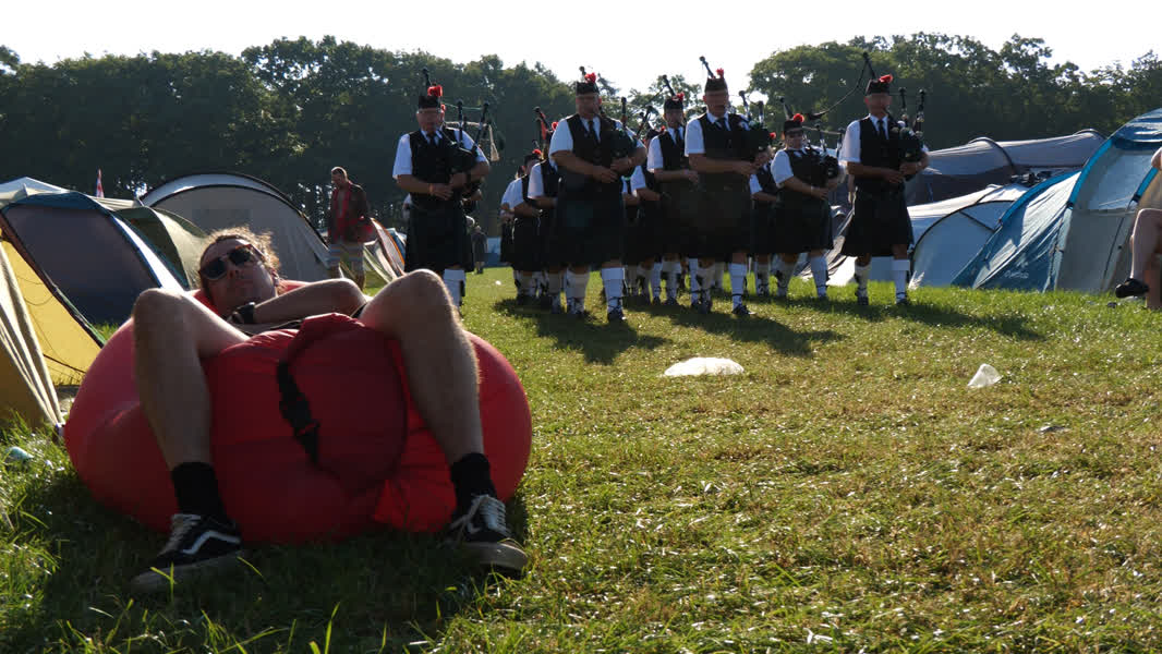 Een compleet doedelzakkorps is de wekker op de Zwarte Cross camping