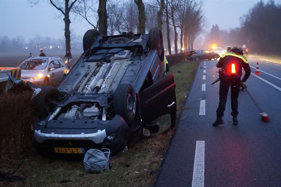 Een van de auto’s kwam daarna op de kop in de berm tussen de hoofdrijbaan en de parallelweg terecht, de andere bleef dwars op de rijbaan staan. Een van de bestuurders is voor controle afgevoerd naar het ziekenhuis, maar volgens de politie vielen de verwondingen mee.