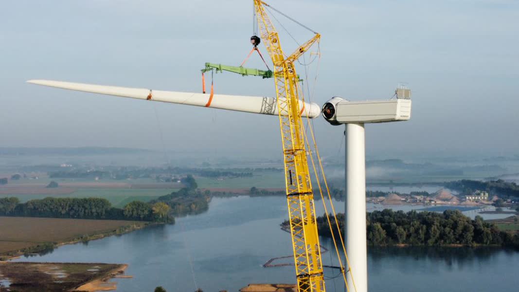 De eerste windmolen van Windpark Den Tol is zondag voorzien van de wieken. In totaal moeten er begin volgend jaar negen windturbines draaien in het buitengebied van Netterden.