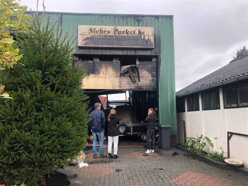 De hal van een parketbedrijf in Didam is tot afgrijzen van de eigenaar Chris Siebes in de nacht van dinsdag op woensdag verloren gegaan bij een zeer grote brand. Hij zag voor zijn ogen hoe de vlammen metershoog uit het pand aan de Parallelweg sloegen.