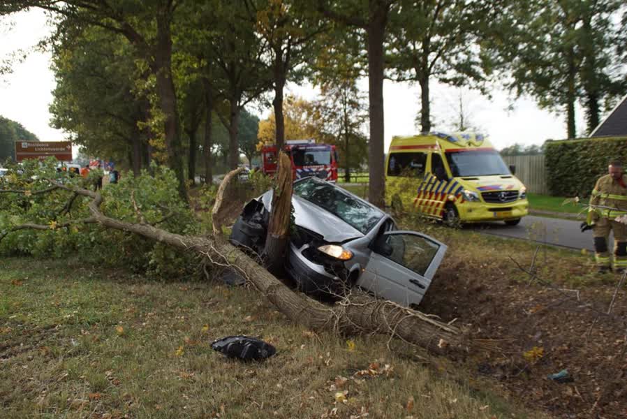 Omstanders schoten de bestuurder te hulp. Ambulancepersoneel heeft de man nagekeken, maar hij hoefde niet mee naar het ziekenhuis. De auto is zwaar beschadigd afgesleept.