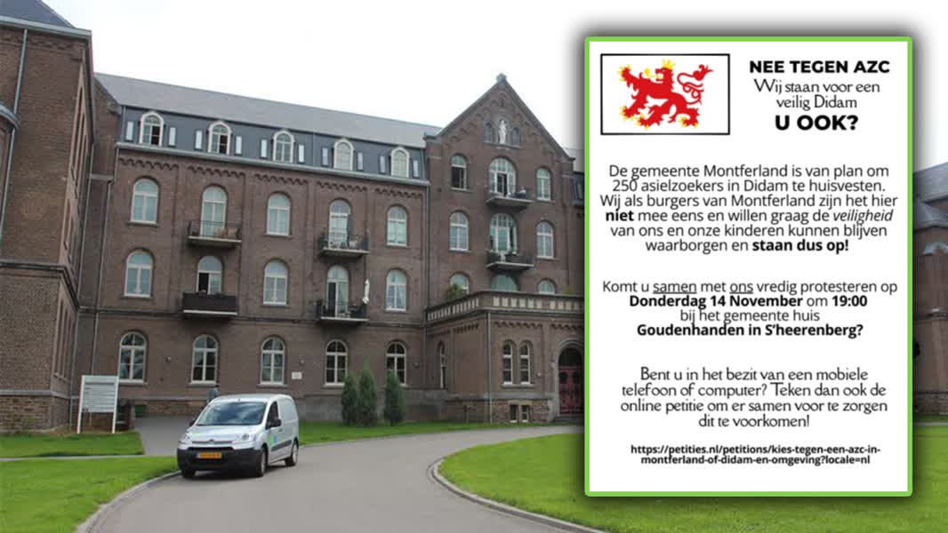 ‘De gemeente Montferland is van plan om 250 asielzoekers in Didam te huisvesten. Wij als burgers van Montferland zijn het hier niet mee eens en willen graag de veiligheid van ons en onze kinderen kunnen blijven waarborgen en staan dus op’, valt er te lezen in een statement op de Facebookpagina ‘Geen AZC in Montferland/Didam e.o’. Daarna volgt er een oproep: ‘Komt u samen met ons vredig protesteren op Donderdag 14 November om 19:00 bij het gemeente huis Goudenhanden in ‘s- Heerenberg?’ Hoeveel mensen er op het protest afkomen is niet duidelijk.