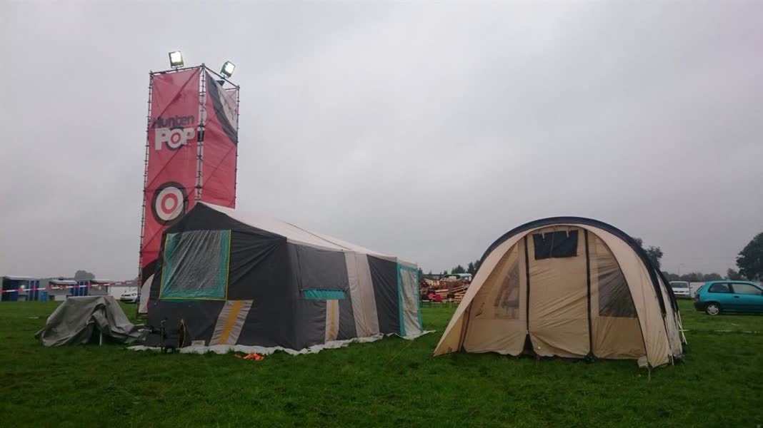 Het slechte weer maakte het opbouwen van de tenten niet makkelijker. “Het staat er een beetje gammel bij. De stokken braken meteen af. Nog een tentje eronder gezet met een ander zeiltje overheen. Dan hoop ik dat het goed komt.” De campinggasten laten zich niet tegenhouden. “Met een biertje straks komt alles wel weer goed.”