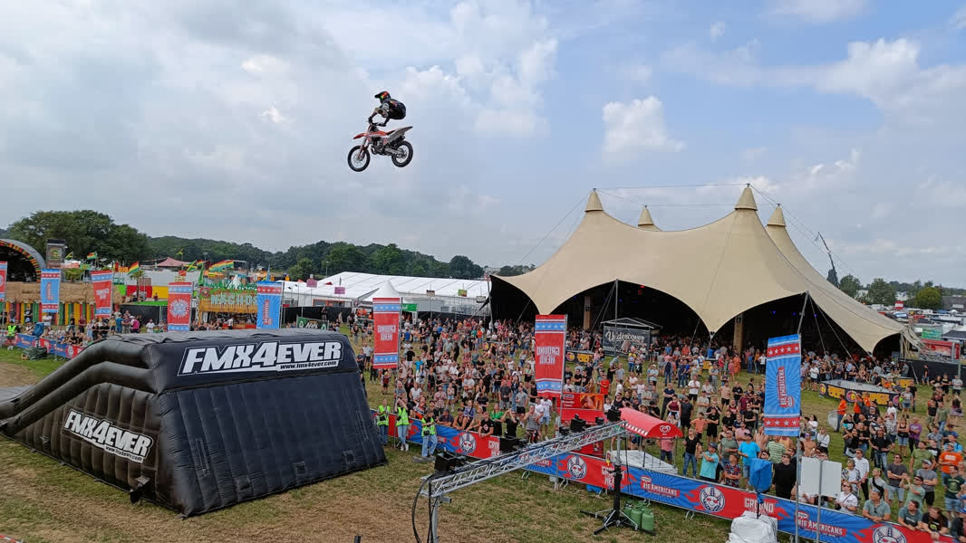 Festivalbezoekers kijken hun ogen uit in de stunt area van de Zwarte Cross. Op 'Ground Hero' laten bestuurders van motoren, BMX-fietsen of andere voertuigen hun beste trucs zien en dat trekt veel bekijks.