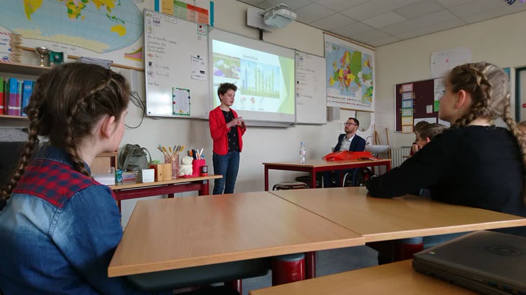 "Ik fiets elke dag over een weg en daar ligt heel veel afval", vertelt Fien Snelting. "Ik dacht: hier moet ik wat aan gaan doen, want dit is niet echt normaal. Toen heb ik een brief gestuurd naar de burgemeester en zijn we samen tot de oplossing gekomen dat we gastles kunnen gaan geven zodat kinderen erover na gaan denken." Van Dijk is erg te spreken over haar ambitieuze werkwijze. "Ik vond dat Fien het heel goed deed", laat de burgemeester weten. Van Dijk en Fien lieten filmpjes zien en vertelden de leerlingen over het belang van recyclen en afval scheiden.