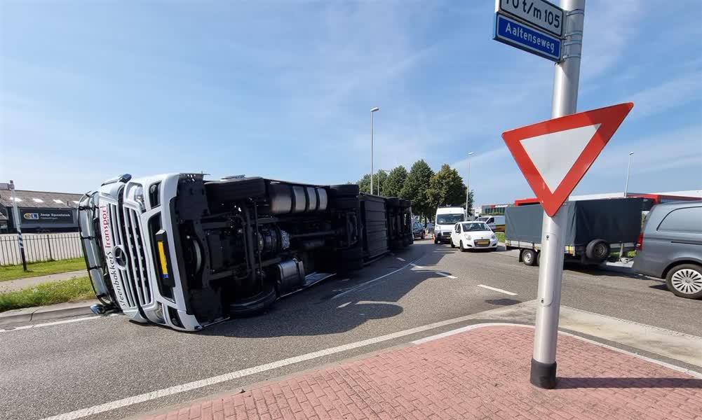 Het verkeer ondervindt dinsdagmiddag grote hinder van een gekantelde vrachtwagen in Varsseveld. Het voertuig, beladen met vlees, blokkeert een afslag van een rotonde richting Aalten.