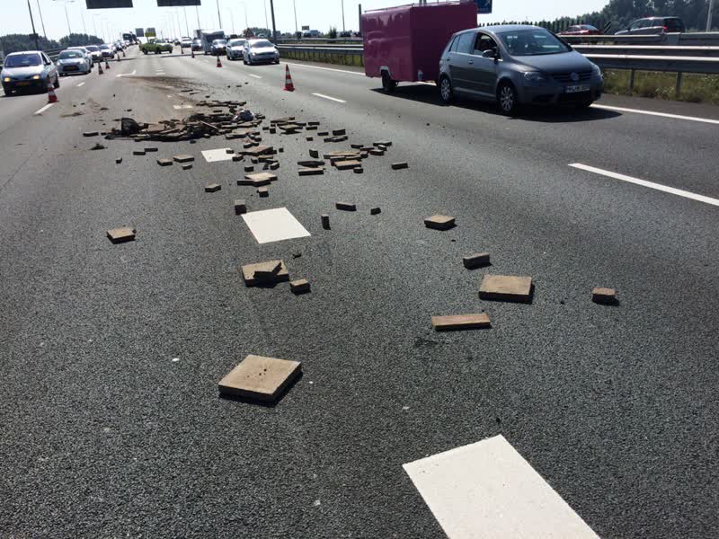 Door nog onbekende oorzaak was een grote lading stoeptegels op de rijbaan beland. In totaal moesten drie rijstroken een tijdlang worden afgesloten wegens opruimwerkzaamheden. Files liepen in die tijd op tot een lengte van 14 kilometer rond 13:00 uur.