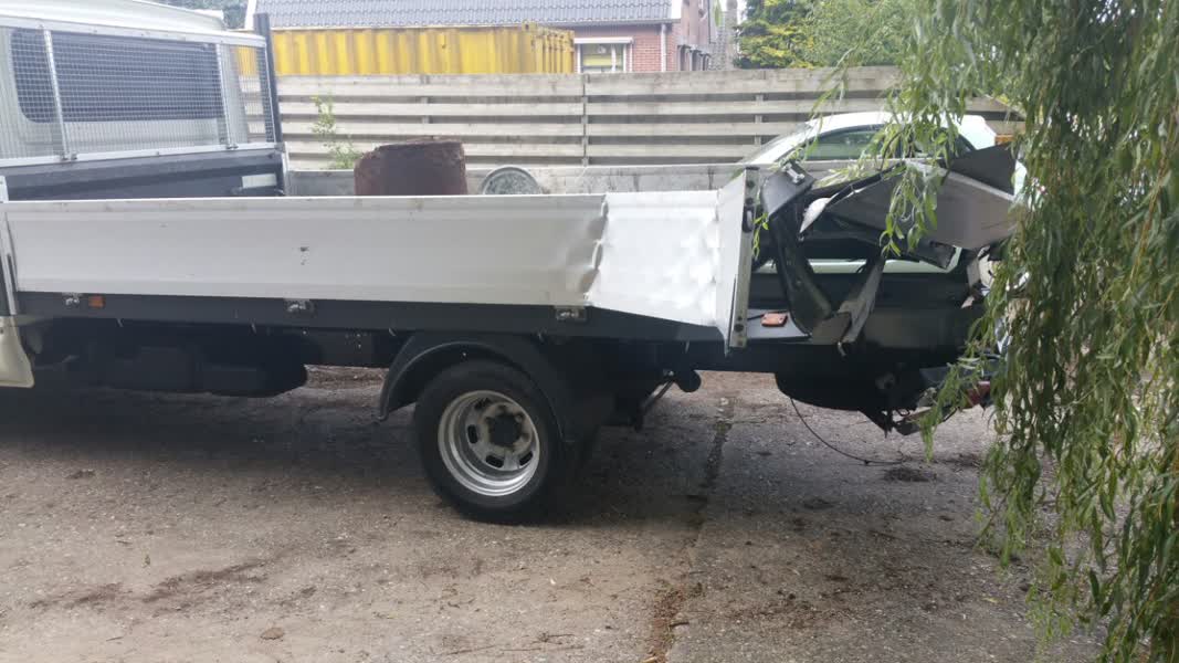 Een auto, vol geladen met oud ijzer, stond langs de Dinxperlosestraatweg. Daarbij ziet de bestuurder van een bedrijfsbus van Liander de auto over het hoofd, die vervolgens op de achterkant van de auto rijdt.