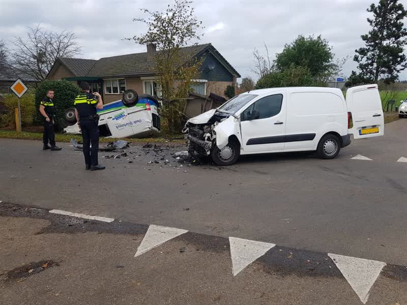 Een busje van de gemeente Oude IJsselstreek is donderdagmiddag op de kop in een tuin terechtgekomen na een ongeval bij Sinderen. Het voertuig kwam op een kruising in het buitengebied in aanraking met een ander busje.