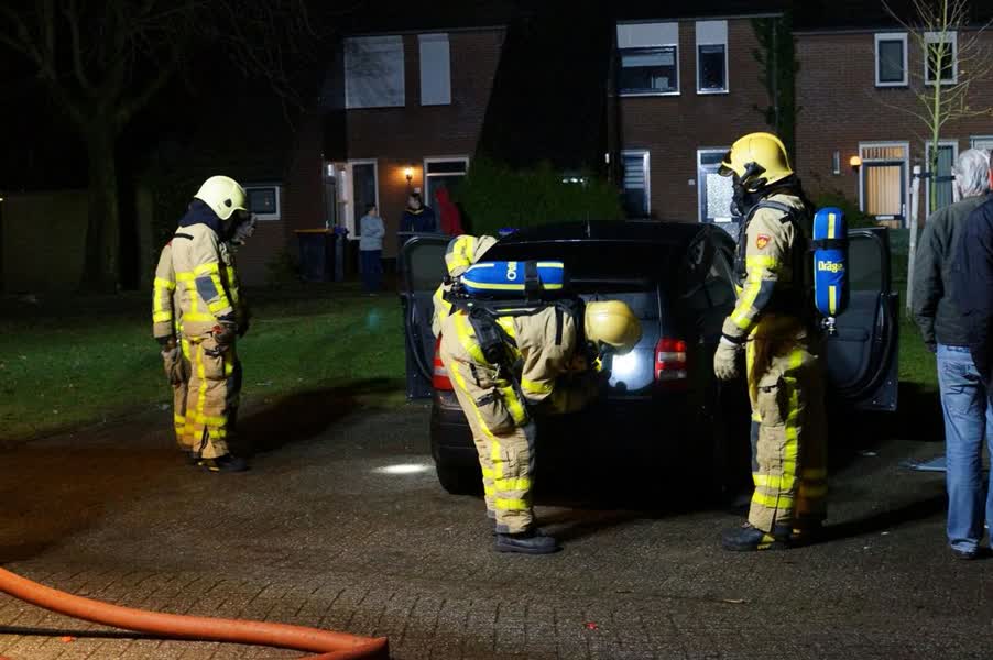 Brandweerlieden hebben enkele spullen uit de auto gehaald en het voertuig geblust. De auto heeft flinke schade opgelopen.