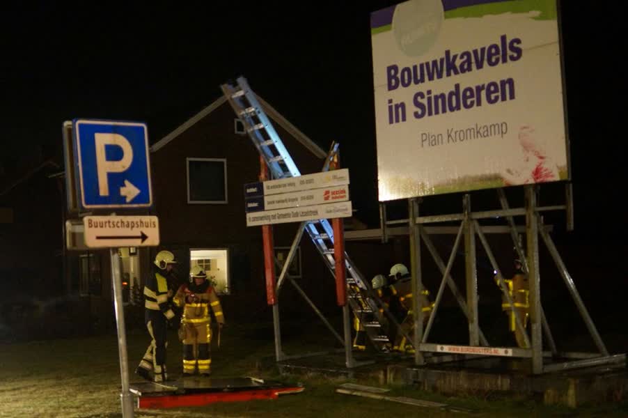 Omwonenden hadden de politie gealarmeerd, omdat het oogde als een gevaarlijk situatie. Door de harde wind was het bord nabij het buurtschapshuis los geraakt. De politie heeft de brandweer ingeschakeld. Deze heeft het bord afgezaagd en naar de grond gehaald.