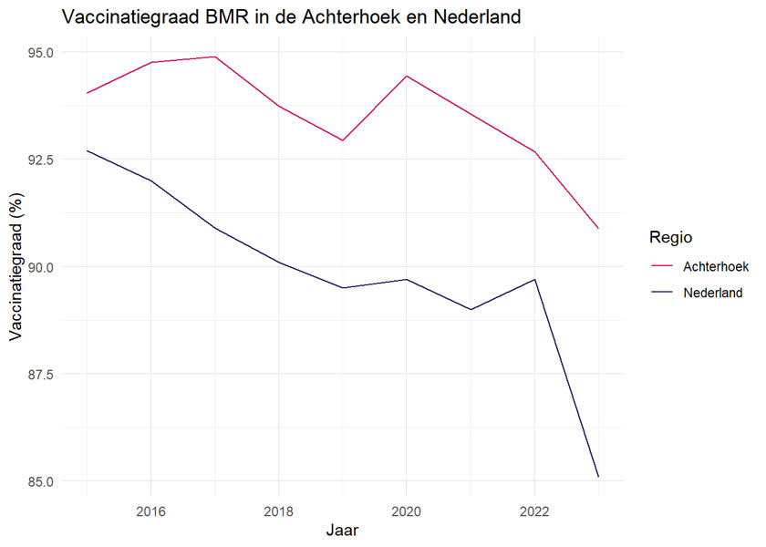 Landelijk neemt de vaccinatiegraad ook af. In 2015 had nog ongeveer 93% zo'n BMR-vaccinatie. Vorig jaar is dit aantal gedaald naar bijna 85%, valt af te lezen in de grafiek. "91% in de Achterhoek is hoger dan het landelijk gemiddelde, maar dit betekent niet dat er geen reden tot zorg is”, legt de GGD-woordvoerder uit. "Voor mazelen moet een vaccinatiegraad van 95% behaald worden voor groepsimmuniteit en om uitbraken te voorkomen. 91% ligt daar dus ook onder. Redenen voor niet-vaccineren die wij horen zijn religieuze en antroposofische overtuigingen en het wantrouwen in de overheid en vaccinaties."