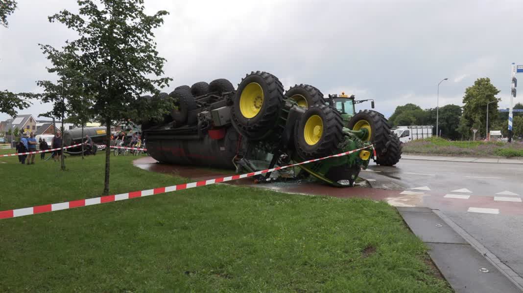 Het ongeluk gebeurde omstreeks 15.15 op de rotonde van de Admiraal de Ruyterstraat met de Nijverheidsweg. Om onbekende reden kantelde de trekker met de giertank en eindigde compleet op de kop. Hierdoor stroomde de inhoud van de tank langzaam de berm in. Er kwam ook mest in de hemelwaterafvoer terecht. Een andere trekker met pompinstallatie kwam ter plaatse om de giertank te legen.
