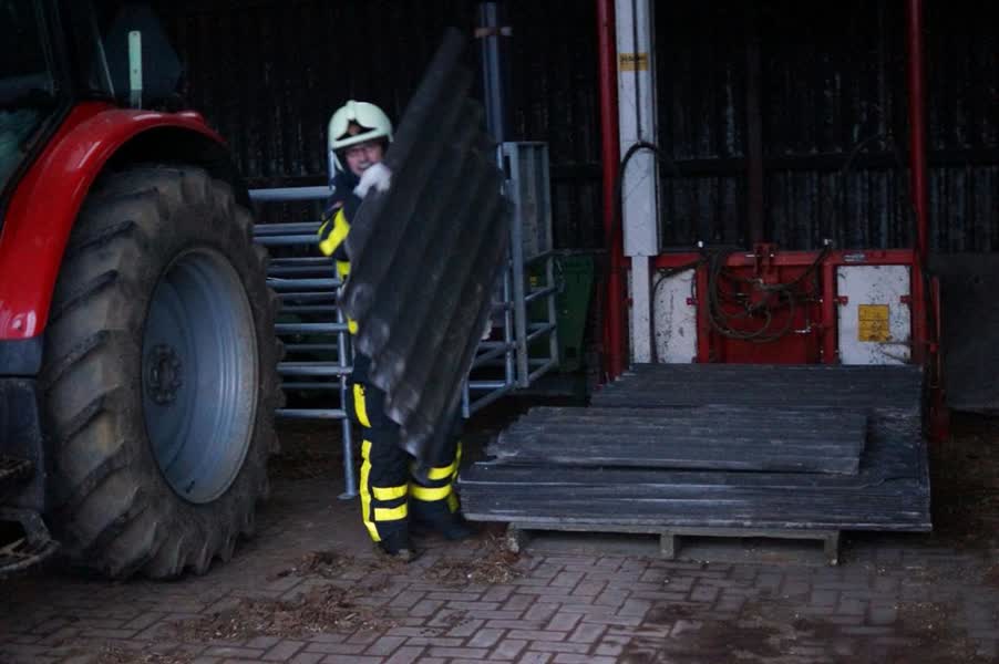 Aangezien de boer nog een aantal oude golfplaten had liggen, konden brandweerlieden helpen om het dak weer waterdicht te krijgen. Het is onbekend of alle koeien inmiddels droge voeten hebben.