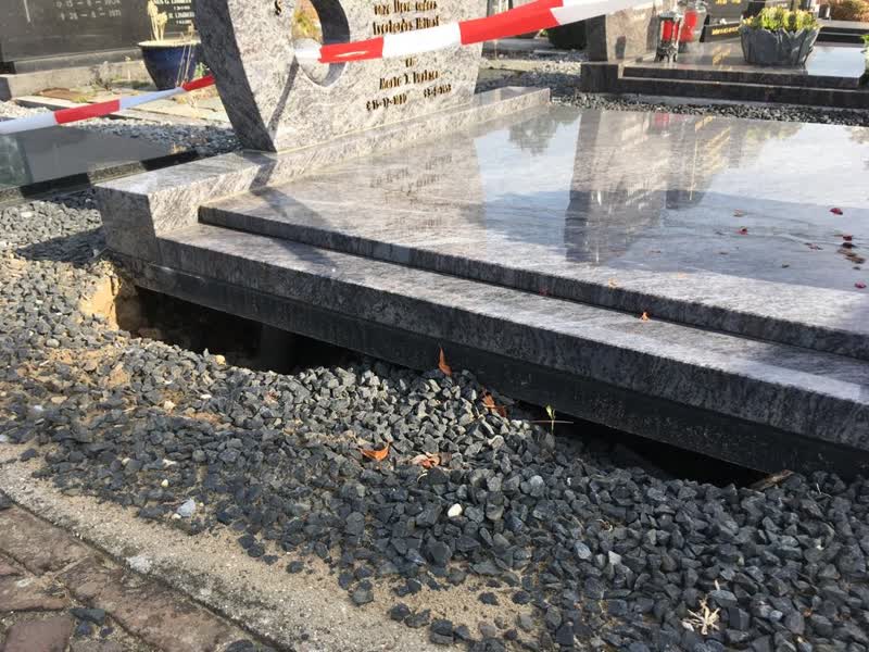 “Voor de veiligheid hebben we de linten opgehangen en hebben we ook een waarschuwingsbordje geplaatst”, zegt beheerder Tonnie Roes van de begraafplaats. Volgens Roes is er geen gevaar dat graven zullen wegspoelen. “De graven rusten op paaltjes in de grond, waardoor de grond eronder verzakt, maar de graven zelf gespaard blijven”, aldus Roes. Volgens de beheerder van het kerkhof gebeurt het wel vaker bij stevige buien dat de grond verzakt, maar van deze omvang heeft Roes nog niet meegemaakt.