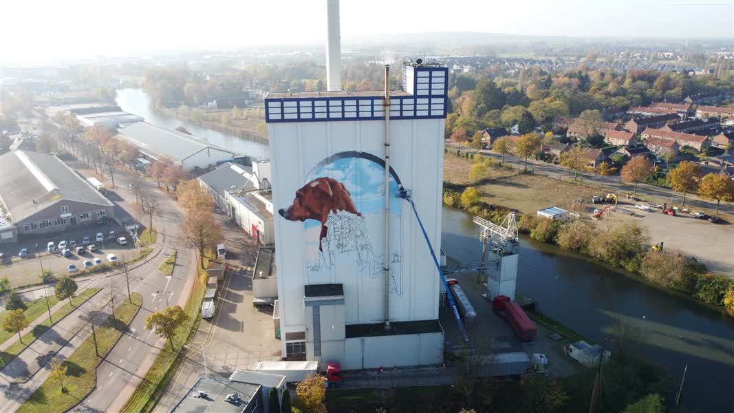 De wand van het bedrijfspand van een diervoederbedrijf bij het centrum van Doetinchem verandert in een gigantisch kunstwerk. Bart Smeets begon vorige week met zijn project, eind november moet de muurschildering afgerond zijn.