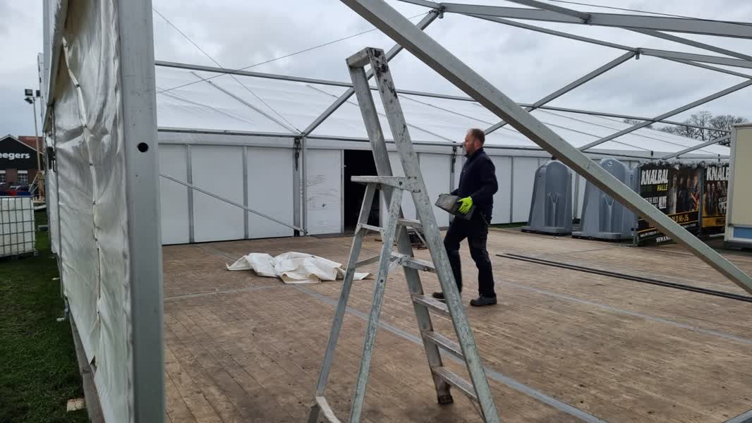 De jubileumeditie van het Knalbal in Halle op oudjaarsdag gaat gewoon door. Met man en macht is gewerkt om de tent op tijd gereed te krijgen voor de 25e editie. Het was nog even spannend, want het feestterrein, inclusief de opgebouwde kerstmarkt van de dorpsschool, werd vlak voor kerst verwoest door een windvlaag. Op de mensen die het gezien hebben, heeft het indruk gemaakt.
