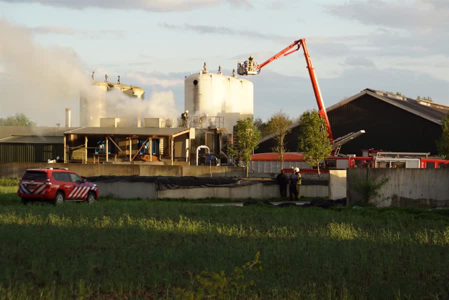 Inmiddels is de brand onder controle. Hoe de mestdroger precies vlam heeft kunnen vatten, is nog onduidelijk.