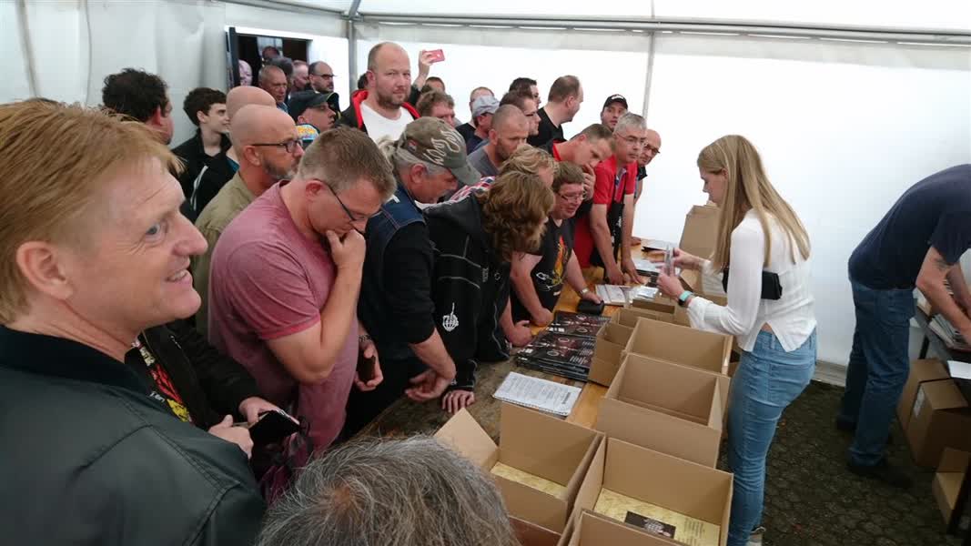 Shirtjes en cd’s zijn in grote getalen te koop op de markt, maar dit jaar waren er wel heel speciale items beschikbaar. Vijfhonderd LP’s van Normaal en enkele singles, waaronder ‘Oerend Hard’ in verbeterde kwaliteit, waren te koop. Dat zorgde voor lange rijen voor de kraampjes bij Café de Tol. “Ik heb twee LP’s en twee singles kunnen krijgen. Leuk voor de verzameling”, zegt een vaste Anhanger.