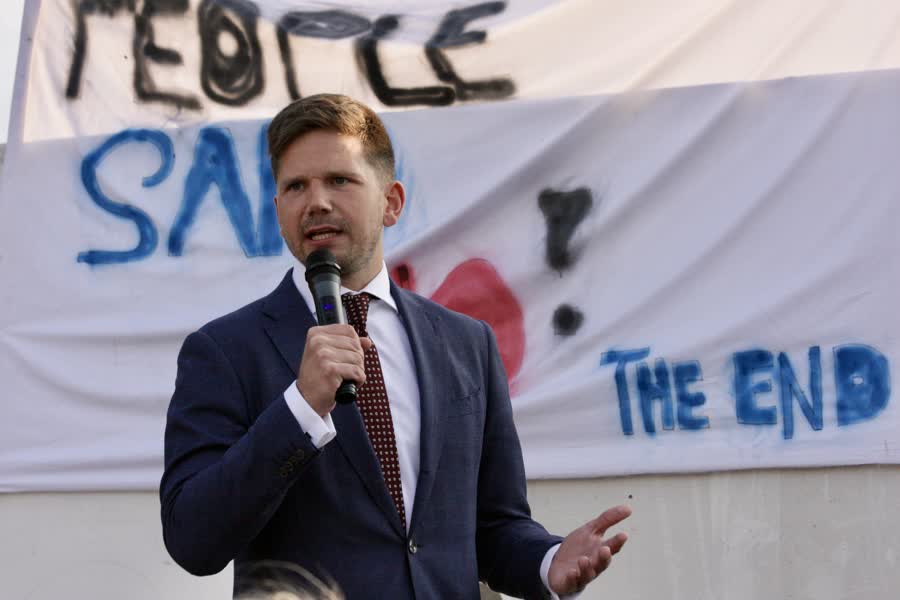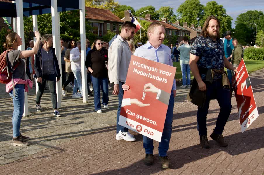 Ook Gideon van Meijeren, Tweede Kamerlid namens Forum voor Democratie, kwam naar Aalten. Op een geïmproviseerd podium sprak hij de menigte toe. “Mijn opa is hier geboren en getogen aan de Lichtenvoordsestraatweg”, begon hij zijn betoog. “Hij heeft gewerkt aan het land waar wij van houden, of zeg maar: ‘van hielden’.”