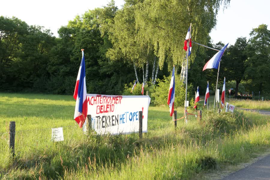 Nederlandse vlaggen op de kop en protestborden aan de weg