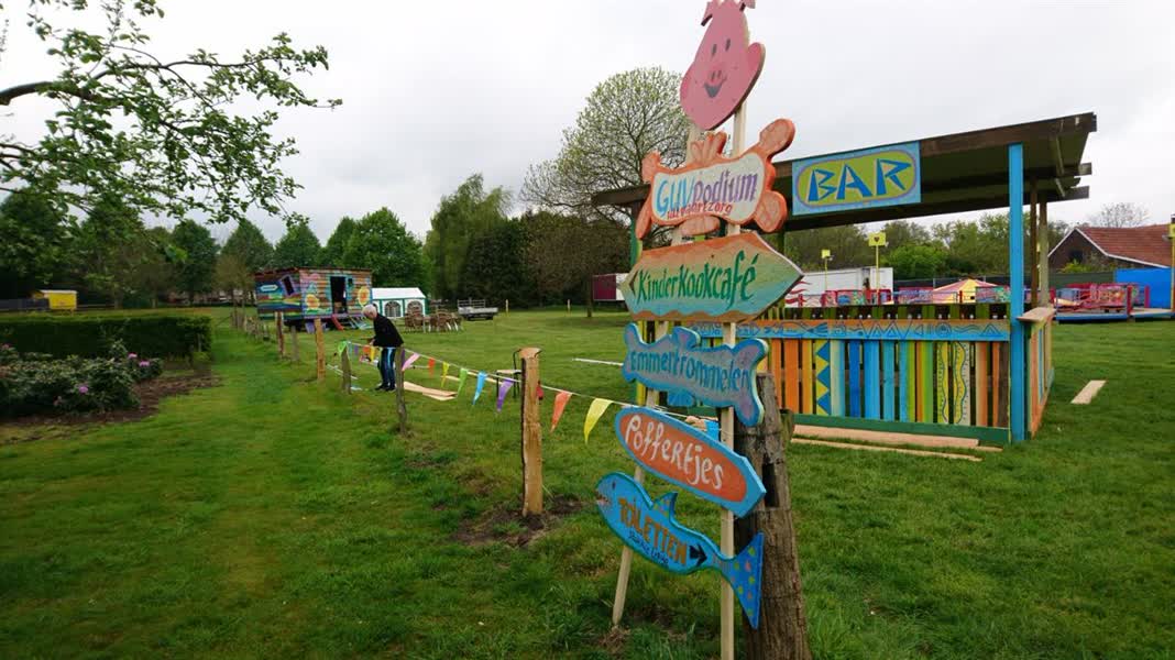 "Vorig jaar was het een grote chaos", vertelt organisator Joost de Gier over de opbouw. "Dit jaar is de chaos heel iets kleiner, want we hebben een dag extra gekregen om op te bouwen." Rondom museumboerderij het Hofshuus staat bezoekers twee dagen theater, muziek en voedsel uit de buurt te wachten. "Wij vullen die sfeer in met allerlei attributen die erbij passen", aldus mede-organisator Marco van der Aar. "Het hoofdpodium is midden in het weiland, de koeienflatsen liggen er nog, dus ik denk dat Hootchie Koe de naam waarmaakt."
