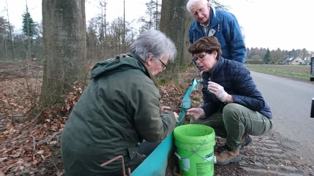 "Alle beesten die we nu vangen zetten we uit op het vroegere asielzoekerscentrum van Doetinchem", aldus bioloog en lid van de werkgroep Henriëtte van der Loo. "Daar hebben ze allerlei plassen. Dat is een soort natuurgebiedje met bos er omheen waar ze kunnen overwinteren." Vorig jaar zette de werkgroep zo'n vijfhonderd padden over de weg heen. Dit jaar zijn die cijfers nog niet gehaald. "Dit jaar zijn we pas bij de kleine honderd, we hebben nog niet zo'n geweldig weer gehad." De vrijwilligers zetten emmers in de grond waar de beesten in terecht komen. Geregeld worden de emmers geleegd en de dieren overgebracht naar hun nieuwe locatie.