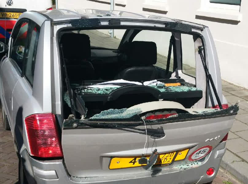 Het wagentje stond geparkeerd aan de Wilhelminastraat. Op foto’s is goed te zien dat de auto voornamelijk aan de achterzijde zware schade heeft opgelopen. Zo is de ruit ingetikt en hangen er diverse draden uit de auto.