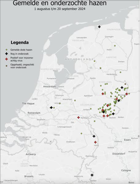 Ook uit Duitse jachtgebieden rond Wesel, Kleve en Venlo komen meldingen binnen. “De meldingen zijn heel lokaal,” zegt een jager van de Winterswijkse wildbeheereenheid, die om meerdere redenen niet met naam genoemd wil worden. “Collega-jagers die verantwoordelijk zijn voor het wildbeheer in het Münsterland, melden juist dat hazen daar geen last hebben van de ziekte. Wat er precies aan de hand is, weet eigenlijk nog niemand. Wat wij jagers wel weten, is dat de hazenstand in de verschillende gebieden heel verschillend is. Veel hangt af van het landschap: kunnen ze genoeg dekking vinden en vooral, is het gebied voldoende voedselrijk?” aldus de jager. Ze voegt eraan toe dat door de langere zomers het aantal hazen flink is toegenomen. “Het blijft langer mooi weer en dus paren hazen vaker. Maar wat we nu aantreffen baart ons zorgen. Een aantal jaar geleden heerste de hazenpest, en nu lijkt er een ziekte te zijn die op myxomatose lijkt. Het is verschrikkelijk om een haas te vinden die eronder lijdt. De meeste sterven, een enkeling overleeft de ziekte.”