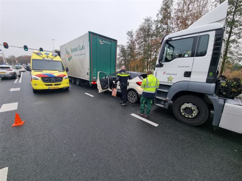 Een vrachtwagenchauffeur die na het ongeval kwam aanrijden heeft zijn voertuig over dwars op de weg gezet om de situatie veilig te stellen. Het verkeer is via één rijstrook langs het ongeluk begeleid. De bestuurster van de personenauto is bij het ongeval gewond geraakt en met onbekend letsel naar het ziekenhuis gebracht.