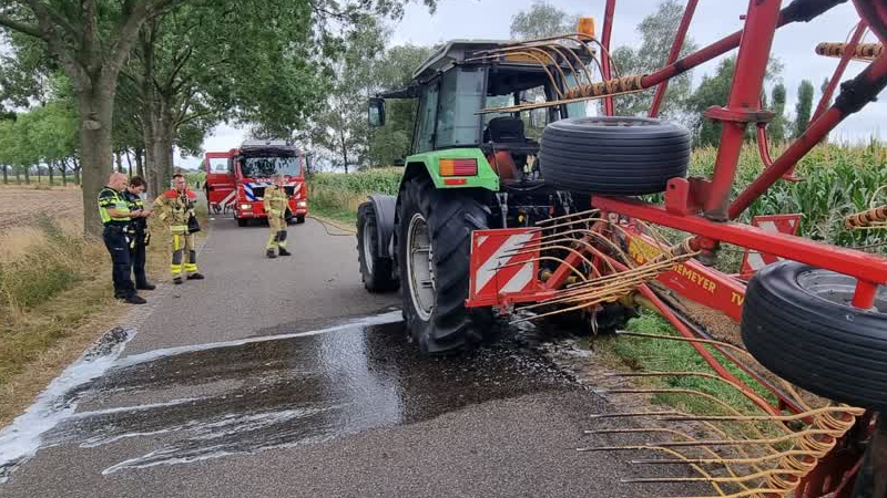 Een trekker met daarachter een hark heeft vrijdagmiddag vlam gevat in het buitengebied van Harreveld...
