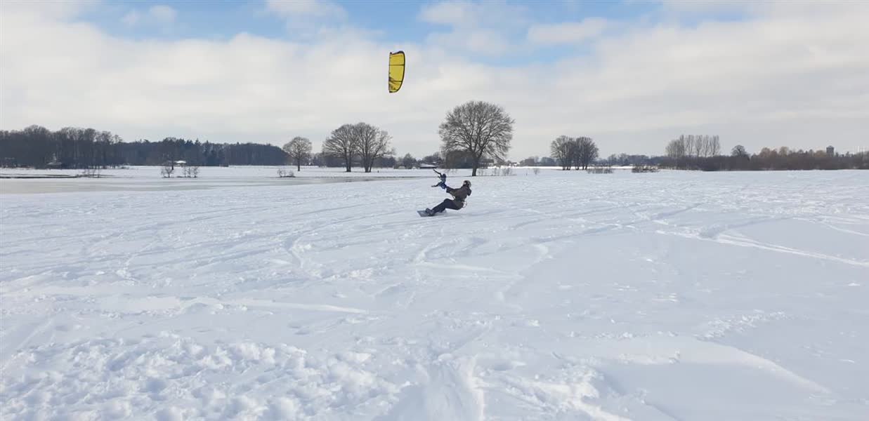 Kitesurfer Jamie Overbeek uit Ulft heeft deze week het IJsselmeer ingeruild voor een weiland in het buitengebied bij Gendringen. Nu de sneeuw blijft liggen zijn de omstandigheden perfect om te snowkiten.