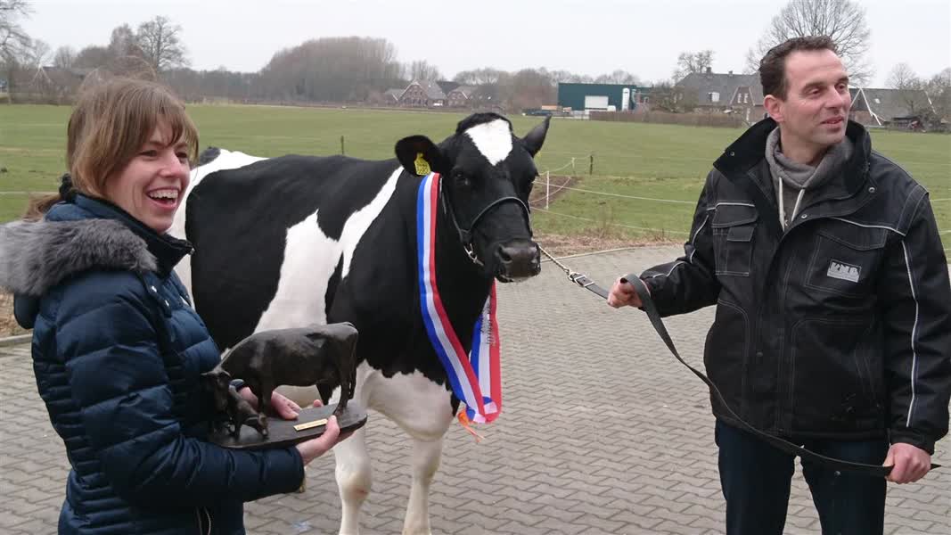 Koe Marieke ontving een beeldje en een sjerp voor haar prestatie, maar laat zich niet van haar stuk brengen. "Marieke is er heel nuchter onder", stelt de trotse Keuper. De koe is een ‘sterkoe 2’, dat wil zeggen een bovengemiddelde melkproductie en goed gebouwd. "Dat ligt niet alleen aan de aanleg, ook aan de verzorging", zo laat Gunnewijk weten. "De koe wordt tiptop verzorgd door deze boer en boerin."