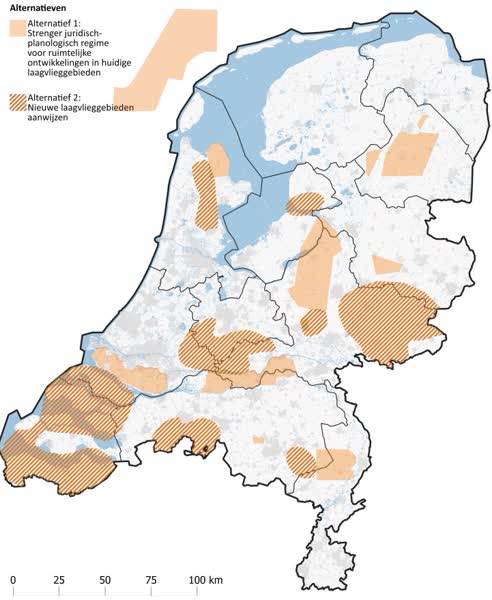 ‘De achterliggende gedachte van het aanwijzen van extra laagvlieggebieden is dat als we alleen de huidige gebieden houden (zie kaart; optie 1) die beter beschermd moeten worden om te voorkomen dat ze op den duur niet meer bruikbaar zijn door de bouw woningen en windparken’, laat een woordvoerder van Defensie desgevraagd weten. In het geval dat optie 2 wordt gekozen, kan de Achterhoek pas in beeld komen om een laagvlieggebied te worden.